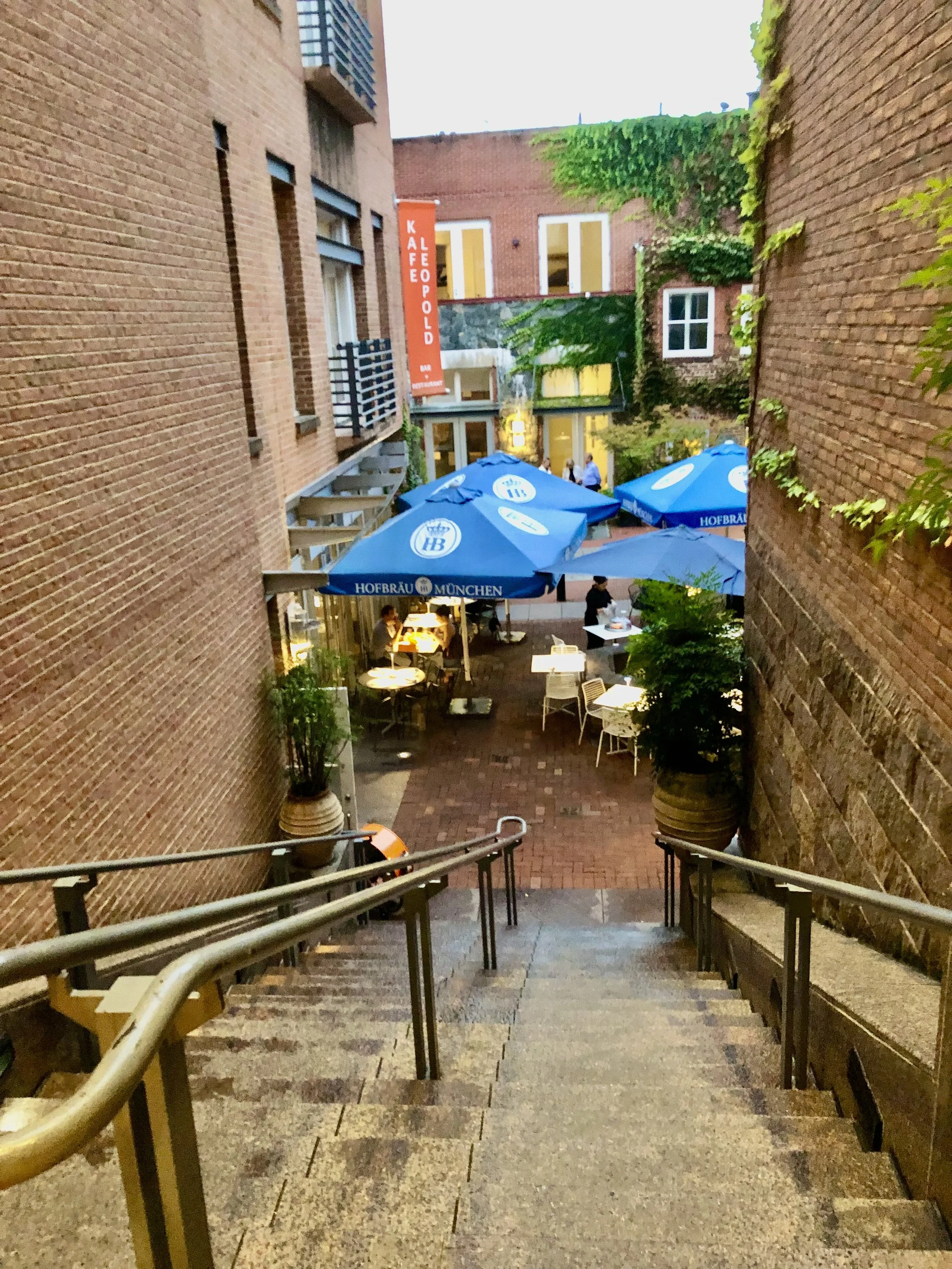 Enter where the sign says, “Cady’s Alley” and walk down the outdoor stairs to the plaza. Ahead of you, you will see charming Kafé Leopold. Walk through the café’s outdoor sitting area and turn right onto Cady’s Alley.