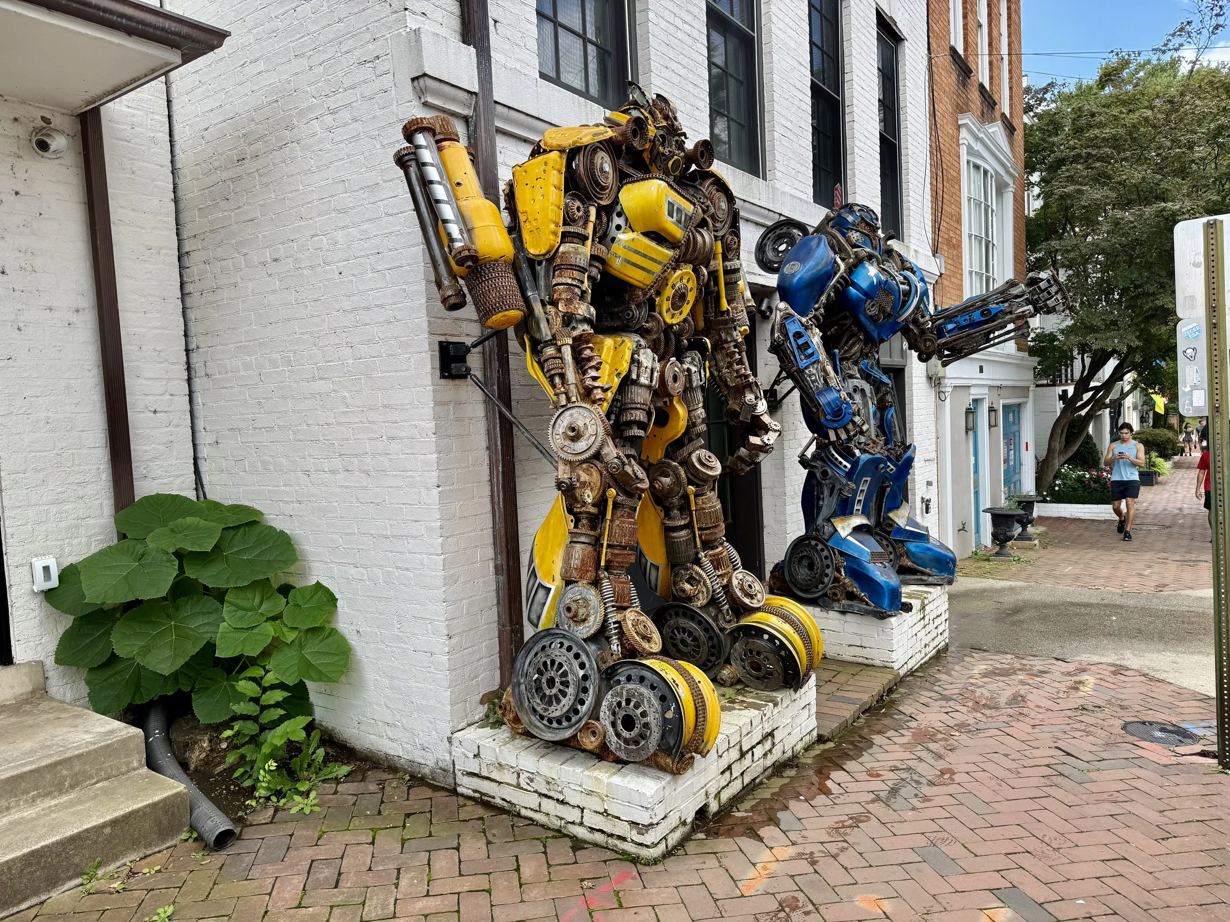 In January 2021, Newton Howard, a cognitive science professor at Georgetown University, installed two 2-ton sculptures depicting the characters Optimus Prime and Bumblebee from Transformers outside his $4 million rowhouse. He said the statues symbolized the potential for cooperation between humans and artificial intelligence or robots. Some neighbors and the Old Georgetown Board (OGB), which has jurisdiction over the exterior architecture and aesthetics of the historic district, hated the statues and said they detracted from the neighborhood's historic Victorian character. The Board unanimously ordered Howard to remove the statues. Howard ignored the order, citing the right of free speech and the fact that children love them and even leave flowers for them. Not only did he ignore the ruling, but according to DCist, he replaced the Optimus Prime statue with an even bigger one, and put the smaller one on the roof. The legal battle continues.