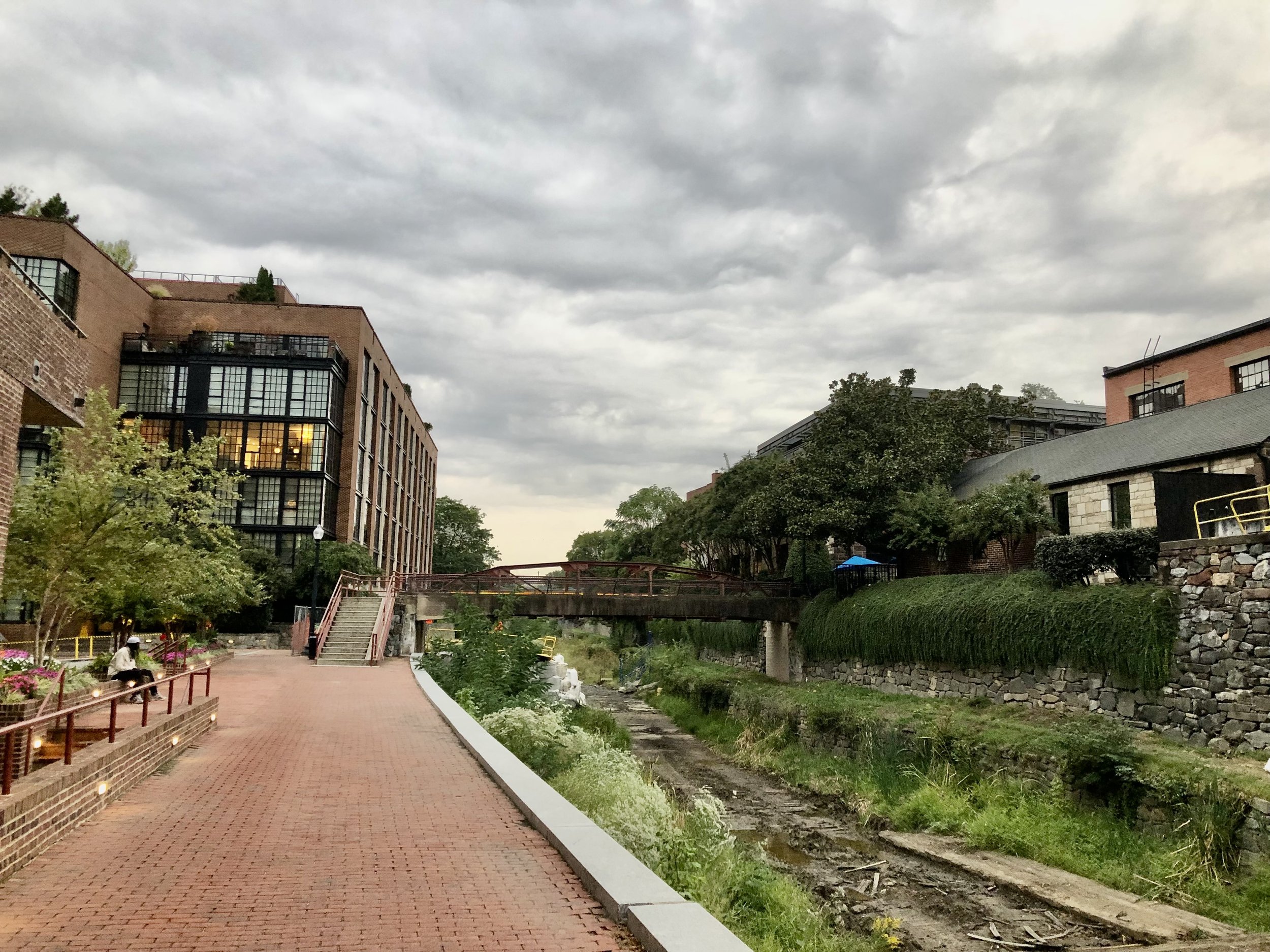 When you ask your Uber driver to bring you to Georgetown Waterfront Park you will most likely get dropped off at the entrance to Washington Harbour, a modern shopping and dining complex anchored by four wedding-venue style restaurants. On weekends, you will see many brides and grooms here! With the river ahead of you, turn right, and you will reach the actual 10-acre park. Stroll along the waterfront and enjoy views of people kayaking, crewing, or taking sightseeing cruises. In addition to the waterfront promenade, there are walkways, benches, and large open lawn areas. If you would like to read some interesting history about Georgetown as you are starting this tour, click here.